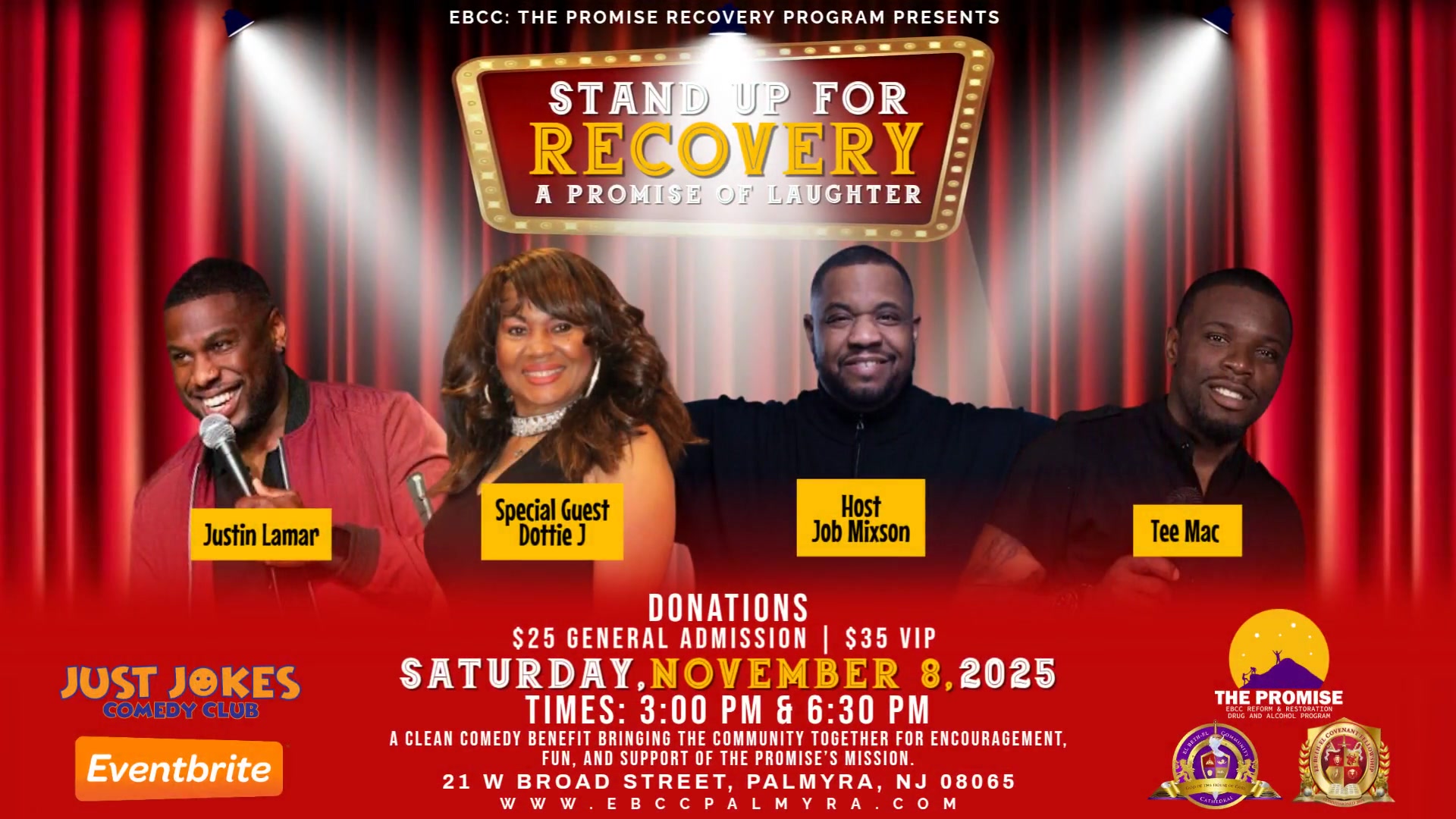 “Get ready for Stand Up for Recovery — two uplifting comedy shows on Saturday, Nov 8th at 6:30 PM. Hosted by Job Mixson with special guest Dottie Jay. A night of clean comedy, encouragement, and community. Tickets: $25 GA / $35 VIP.”
